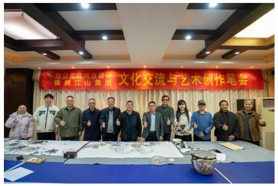 2025年12月5日下午,以“书画为媒,赋能企业文化建设”为主题的“文化共建”活动在株洲江山集团总部隆重举行。此次活动由致公党株洲市委会与株洲江山集团联合举办。艺术家们参观了江山集团荣誉室、党建室、企业发展图片展,从中汲取创作灵感,以书画等形式赋能企业,构建资源共享,文化融合新生态。市人大副主任、致公党株洲市委会主委余群明,专职副主席皮贻茂,株洲江山集团党委书记、董事长罗朝阳,党委副书记、总经理易朝阳,党委副书记、副总经理、工会主席喻志强,书画艺术家、书画艺术爱好者参加活动。